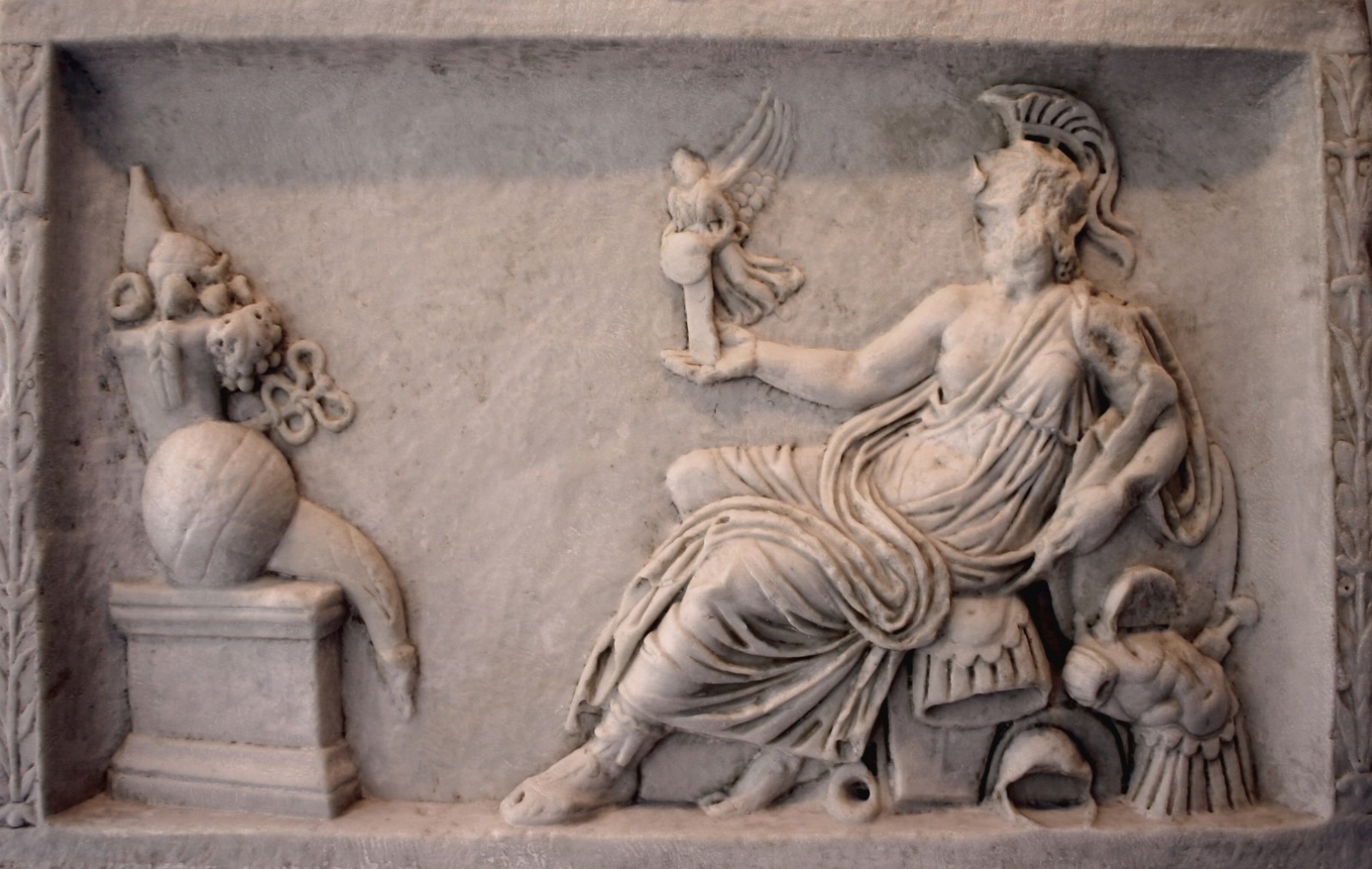 The goddess Roma holding Victory regarding an altar with offerings.