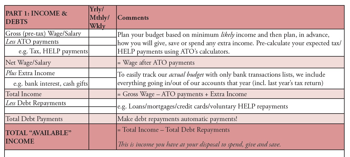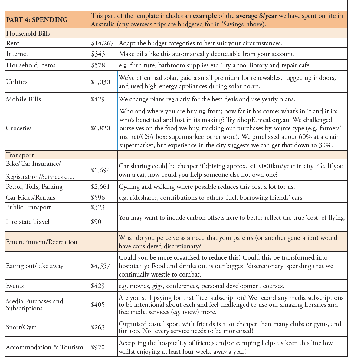 This template includes an example actual budget of Part 4: Spending that includes an average of our yearly budgets over the last three financial years, for a couple in Melbourne with minimal debts. To use this template yourself, download the pdf or (editable) word document.